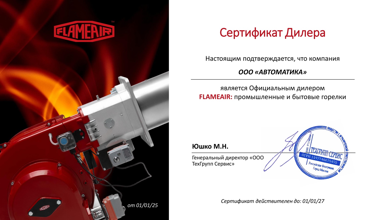 ООО «АВТОМАТИКА» получила статус официального дилера производителя промышленного горелочного оборудования — «Flameair».