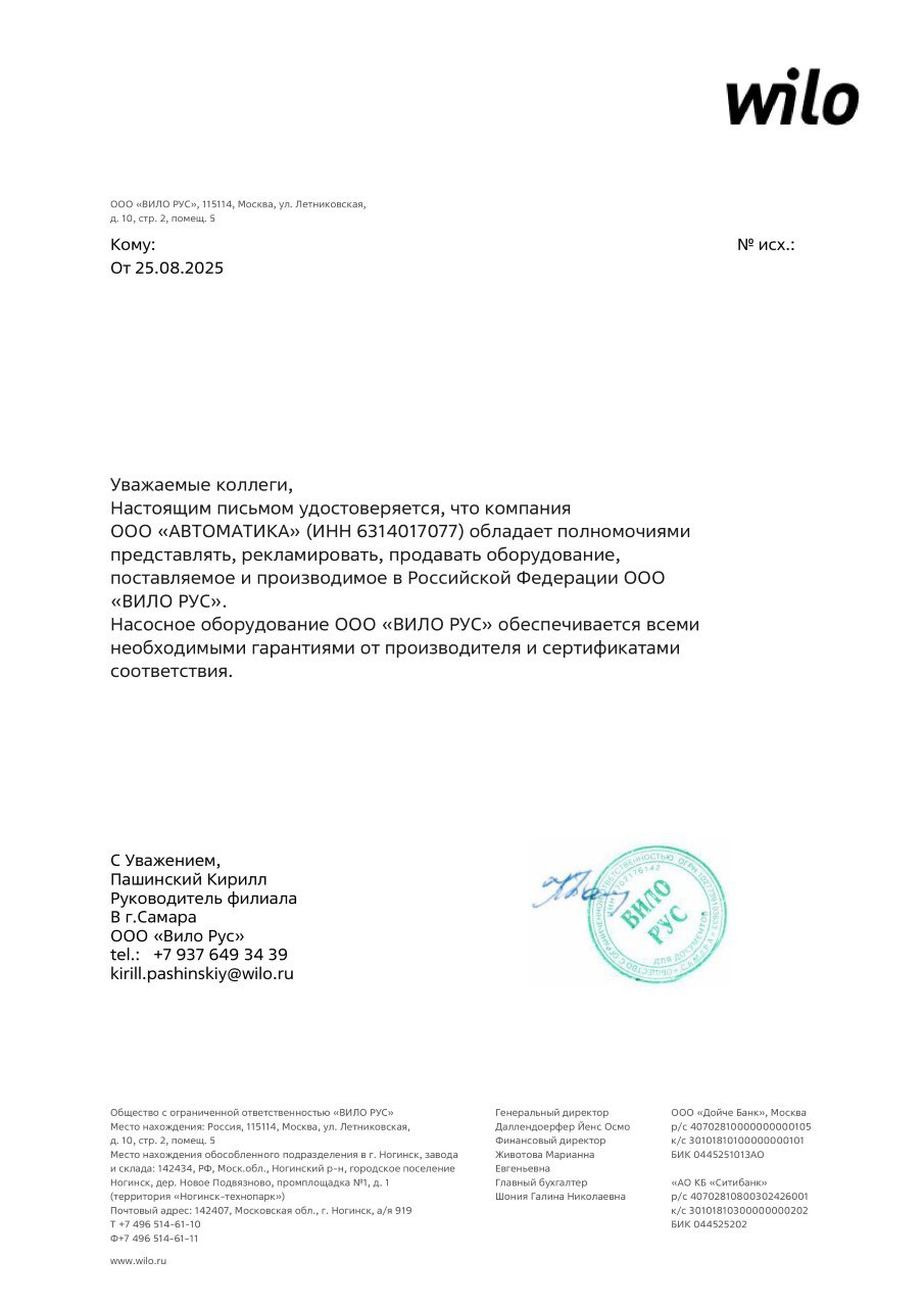 ООО «АВТОМАТИКА» обладает полномочиями представлять, рекламировать, продавать насосное оборудование ООО «ВИЛО РУС».